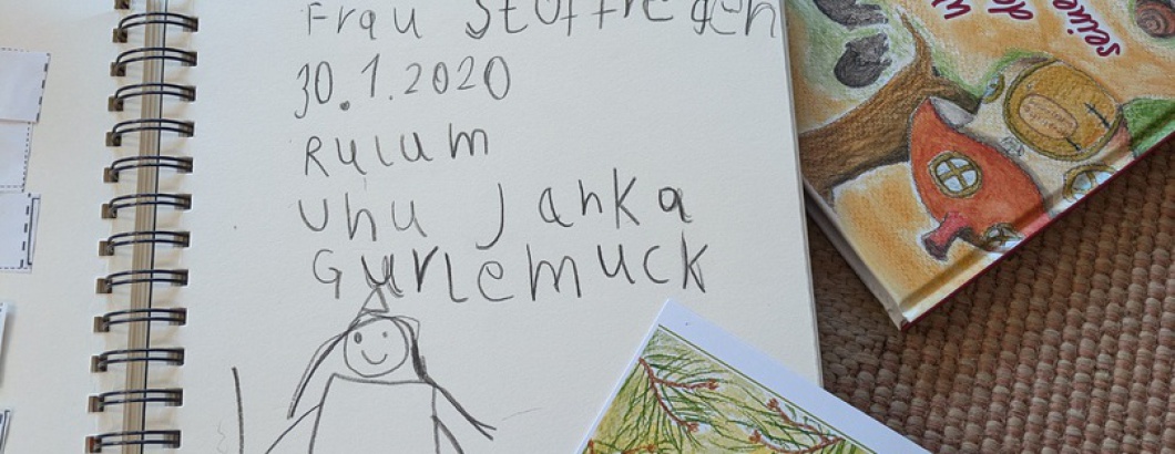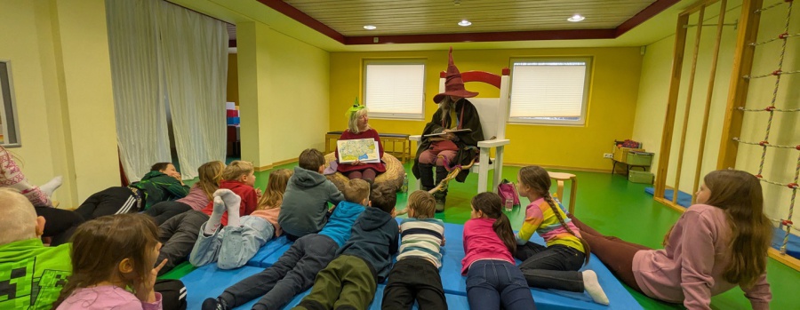 30. Januar 2026 - Mit einem phantasievollen Auftritt begeisterte uns Frau Stoffregen am Vorlesetag: Sie machte uns bekannt mit ihrer Figur "Rulum, der Waldschrat" und stellte uns mit Handpuppen auch seine Freunde Janka, Gurlemuck und die vielen Waldbewohner vor. Eine Zeitreise durch die Monate eines Jahres im Wald und eine Winterbastelei standen auf dem Programm. Mit Kostüm und Stimmeinsatz verzauberte Frau Stoffregen zusammen mit ihrer Schwester ein fasziniertes Publikum. Anschließend konnten die Kinder nach Herzenslust weiße Schneeflocken aus Biegedraht und kreative Einträge ins Lerntagebuch gestalten. Dankeschön für diesen Tag!