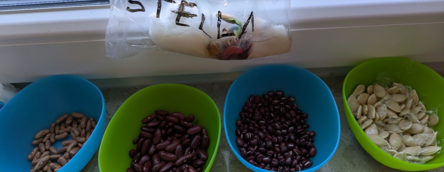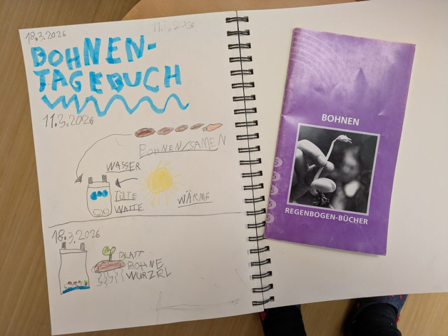 März 2026 - Unsere Klasse 1 forscht derzeit emsig zum Thema Bohnen und Pflanzenwachstum. Dazu hat jedes Kind einen Beobachtungsbeutel vorbereitet - mit Watte und Bohnen gefüllt und ins Fenster gehängt. Die Sonne macht ihre Arbeit und schon sind die ersten Keime, Wurzeln und Blättchen zu sehen! Wir warten gesapnnt, wie groß unsere Pflänzchen wohl werden, bevor wir sie nach draußen umpflanzen.